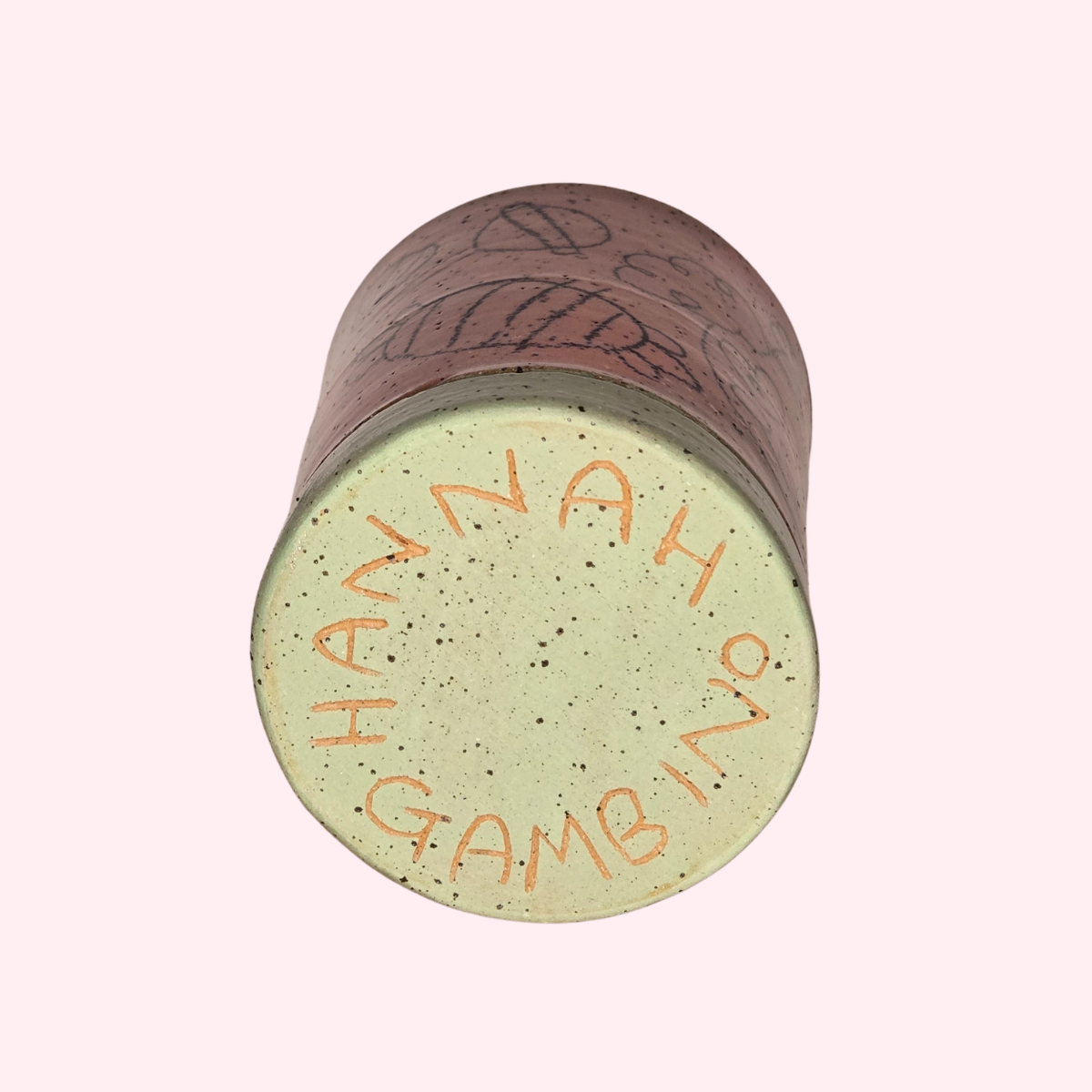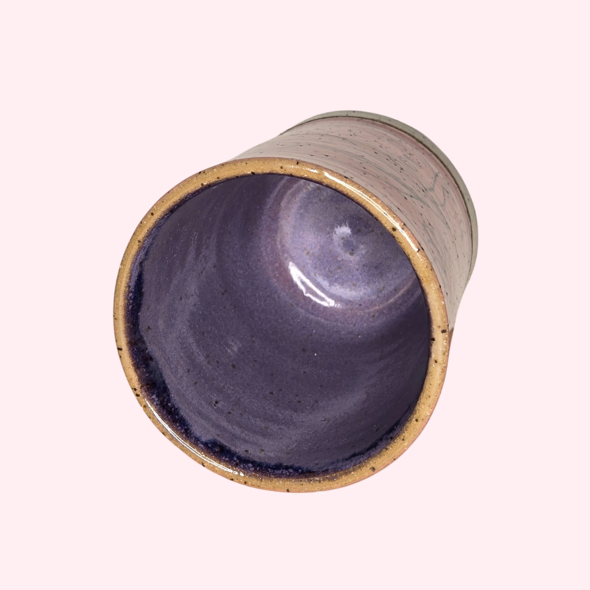 Underglaze decorated outside with clear glaze finish & purple glaze inside.