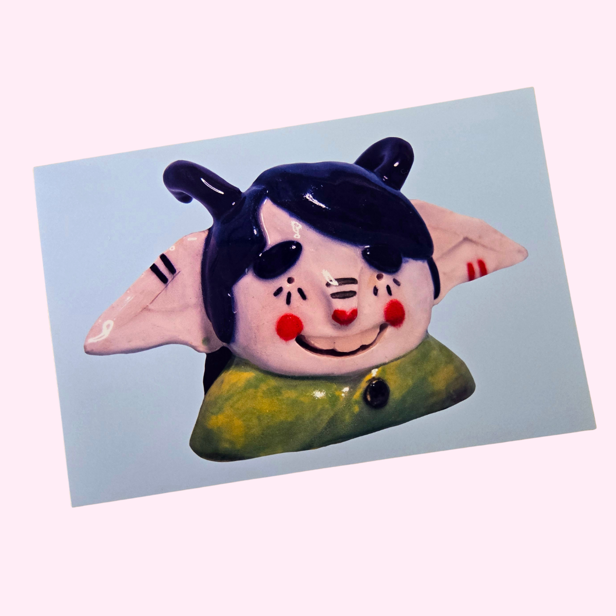 Choose between 3 Ceramic Critter prints for you and other critters to admire: Limerance (Green), Lorelai the Goblin (Blue), or Mr. Puppy Clown (Pink)