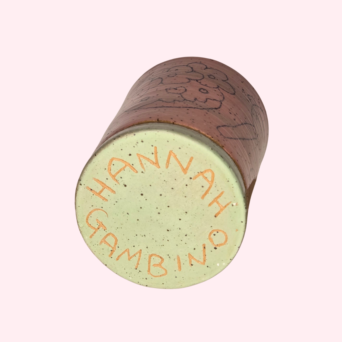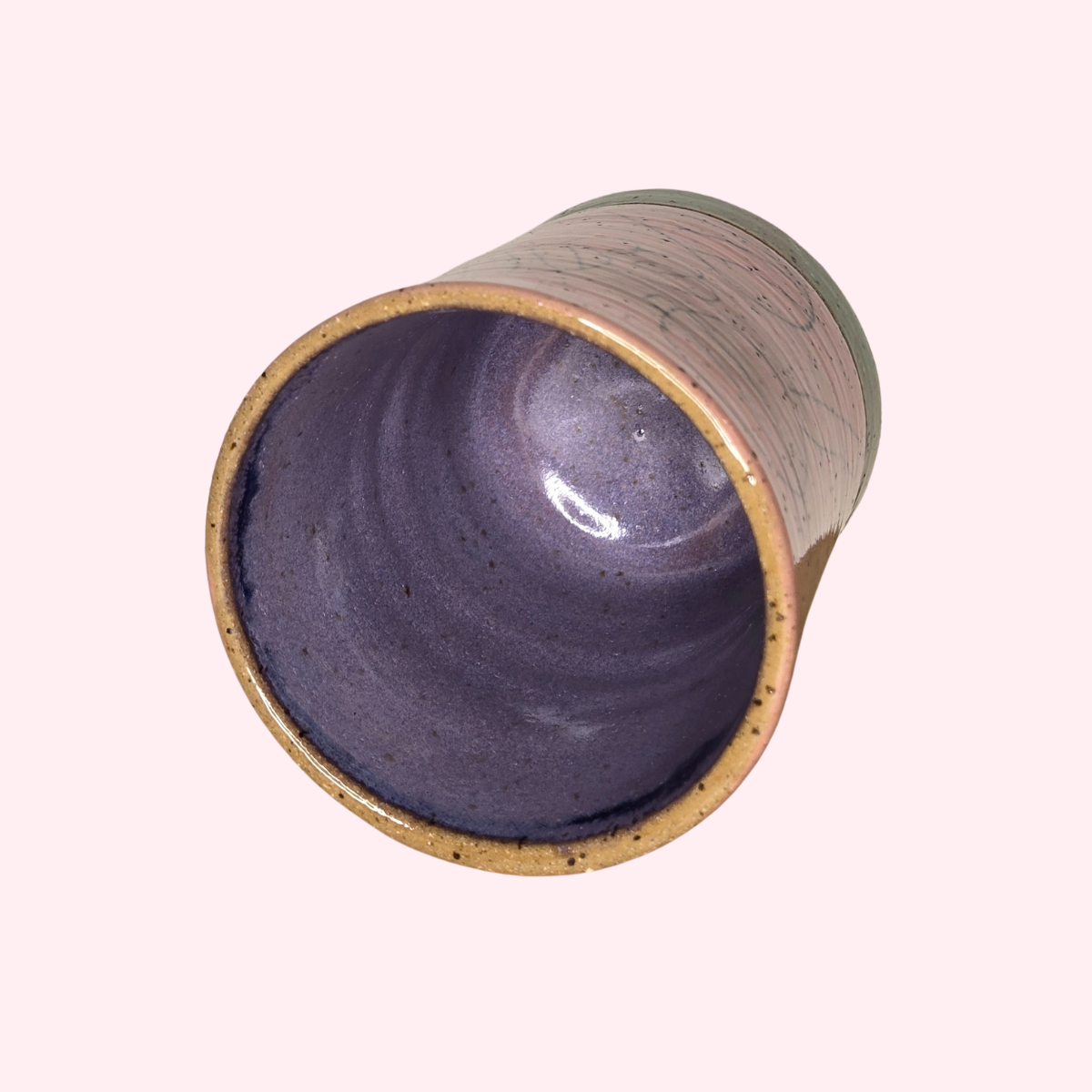 Underglaze decorated outside with clear glaze finish & purple glaze inside.