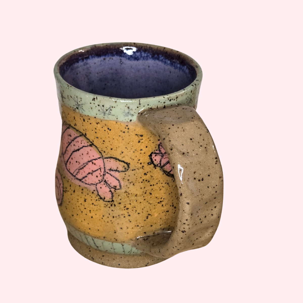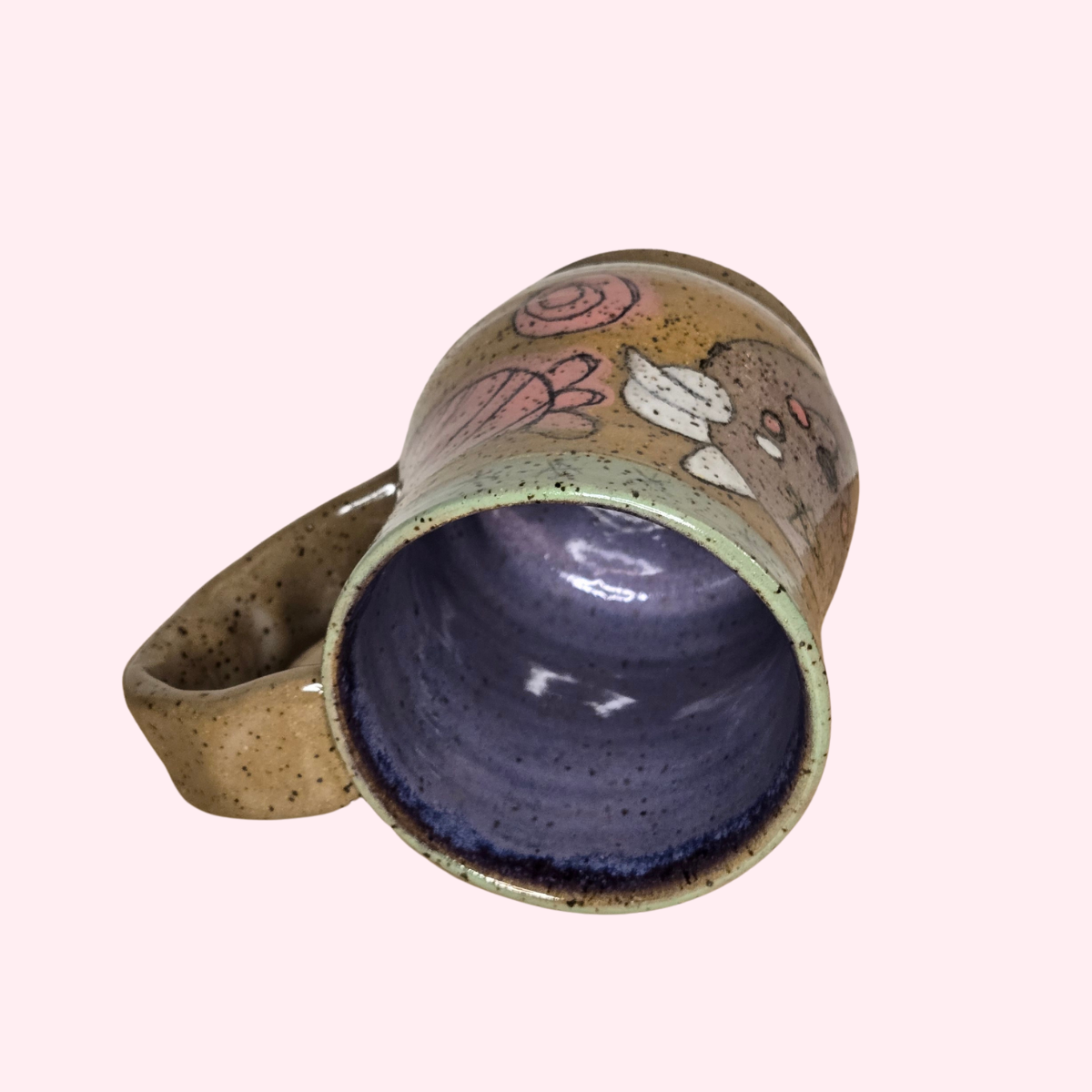 Underglaze decorated outside with clear glaze finish & purple glaze inside.