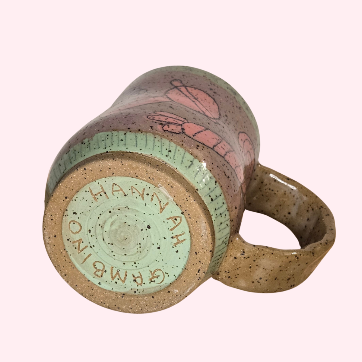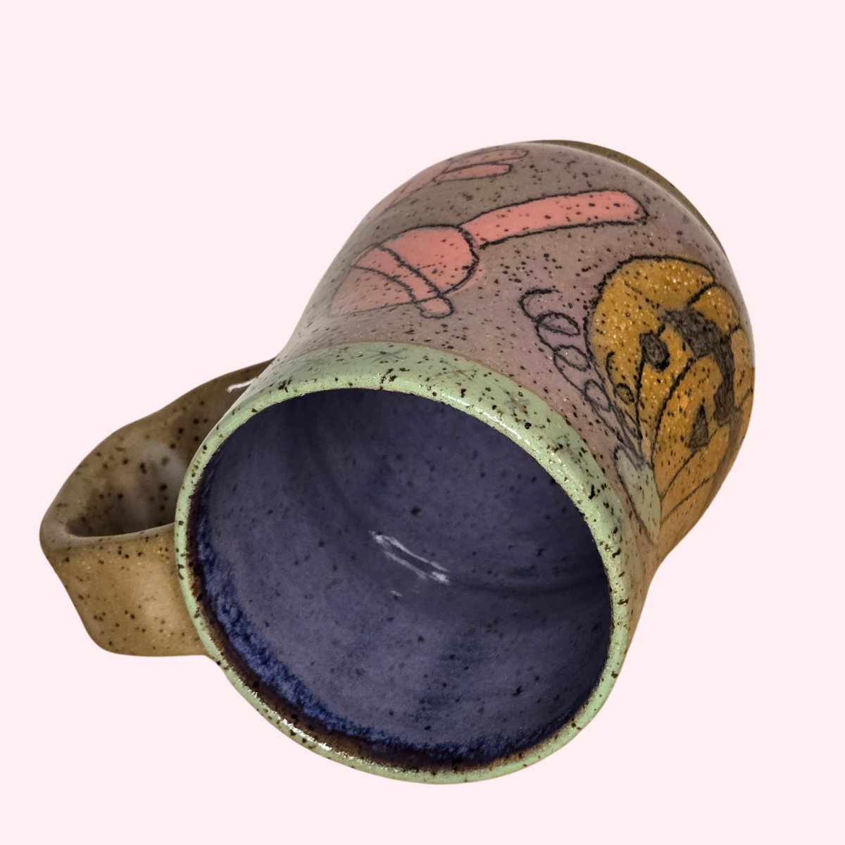Underglaze decorated outside with clear glaze finish & purple glaze inside.