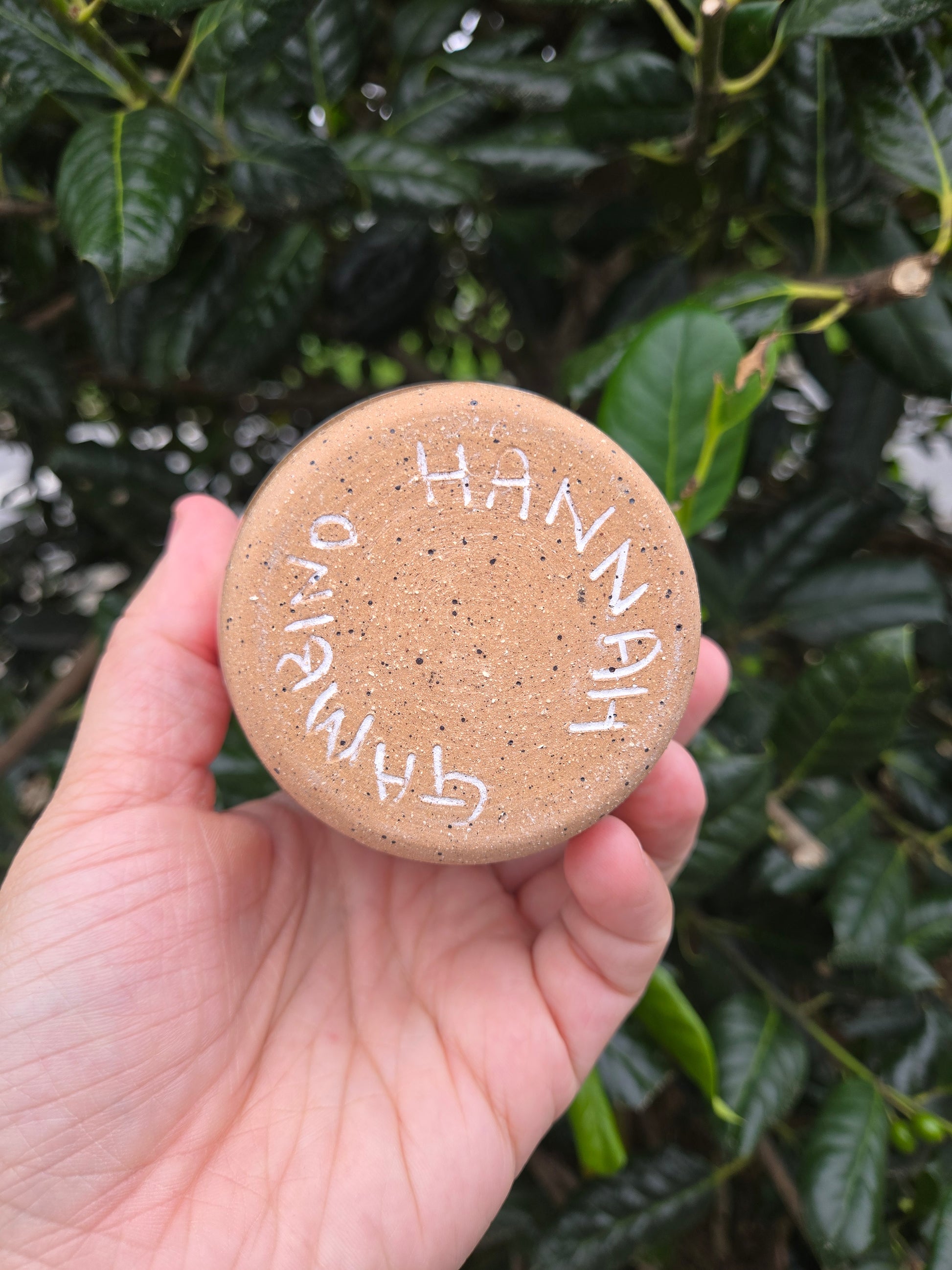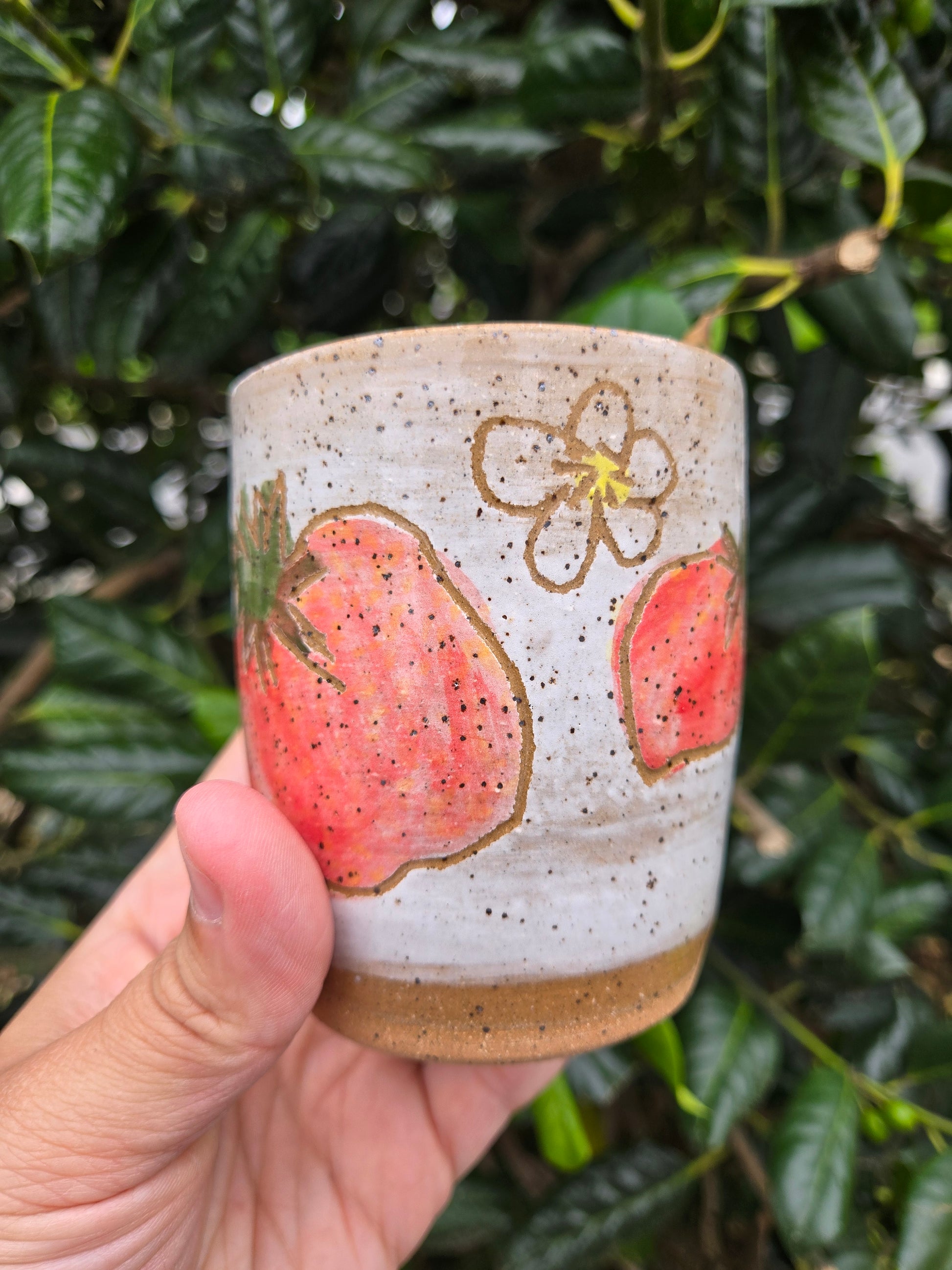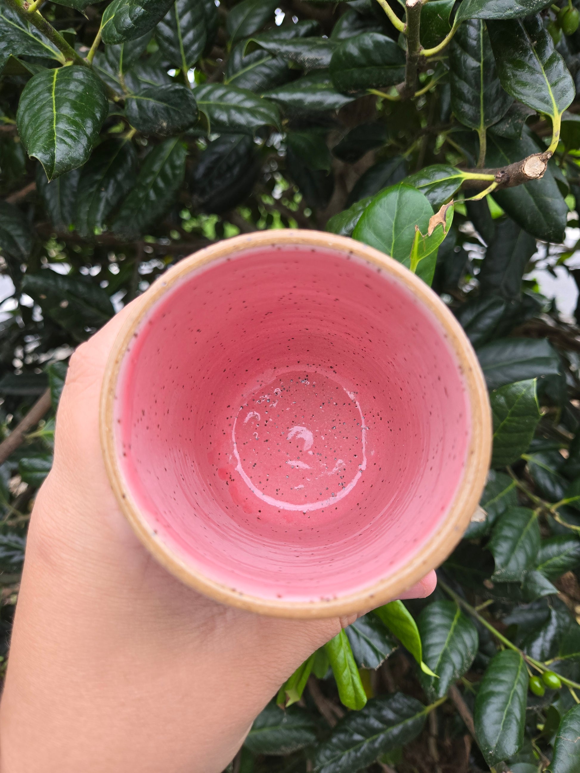 Cups are wheel thrown and their features are carved and underglaze decorated. They're fired with clear glaze outside and pink colored glaze inside, meaning they're water and food safe.