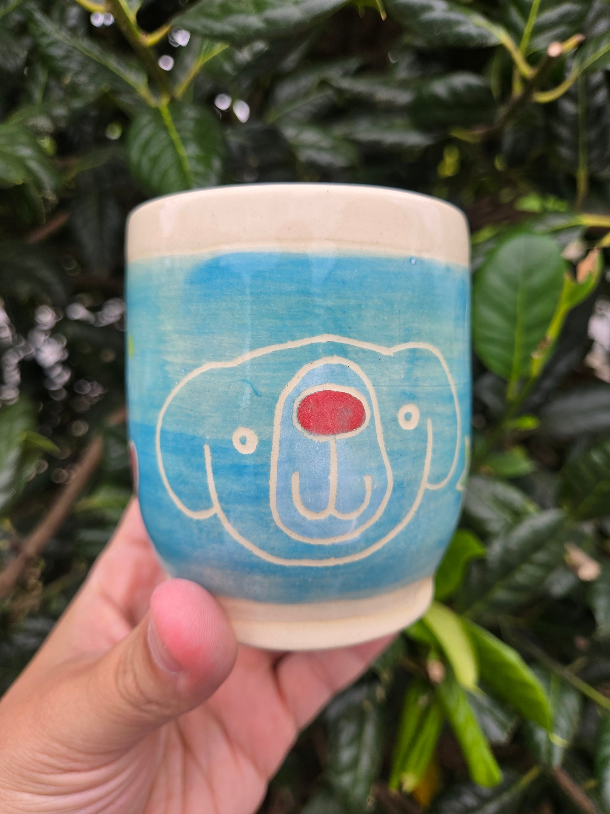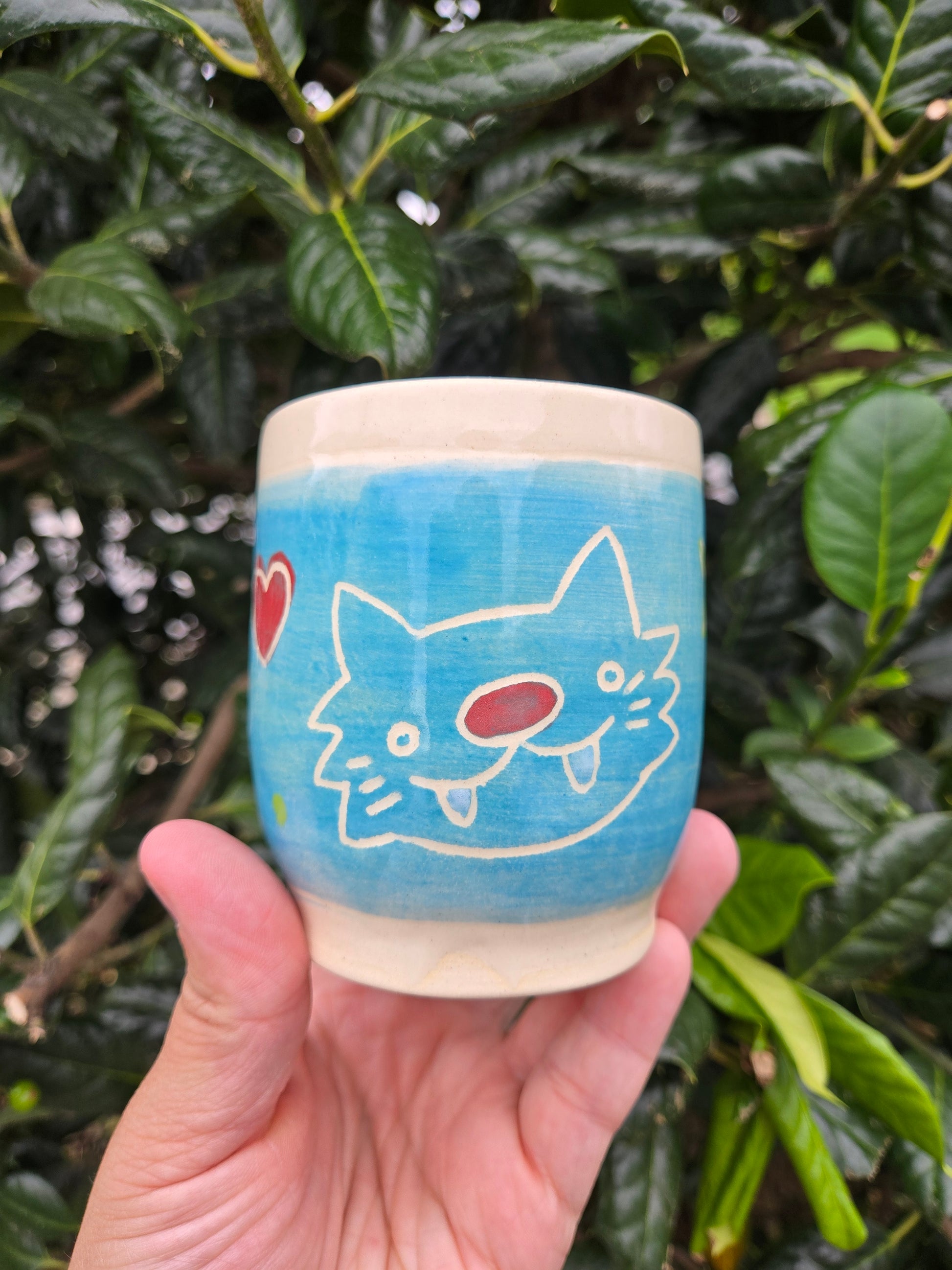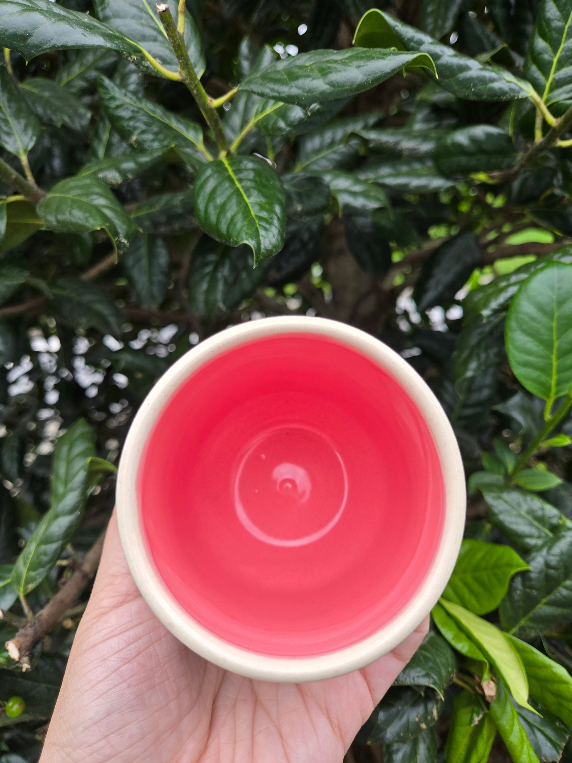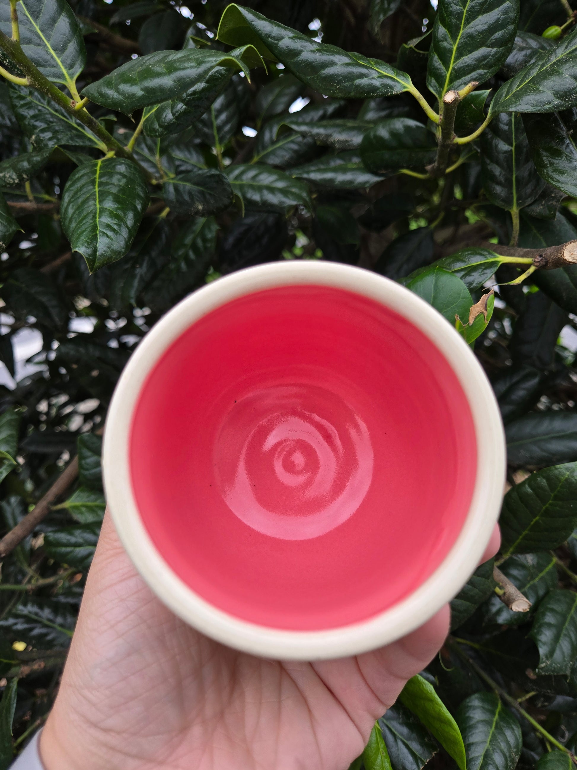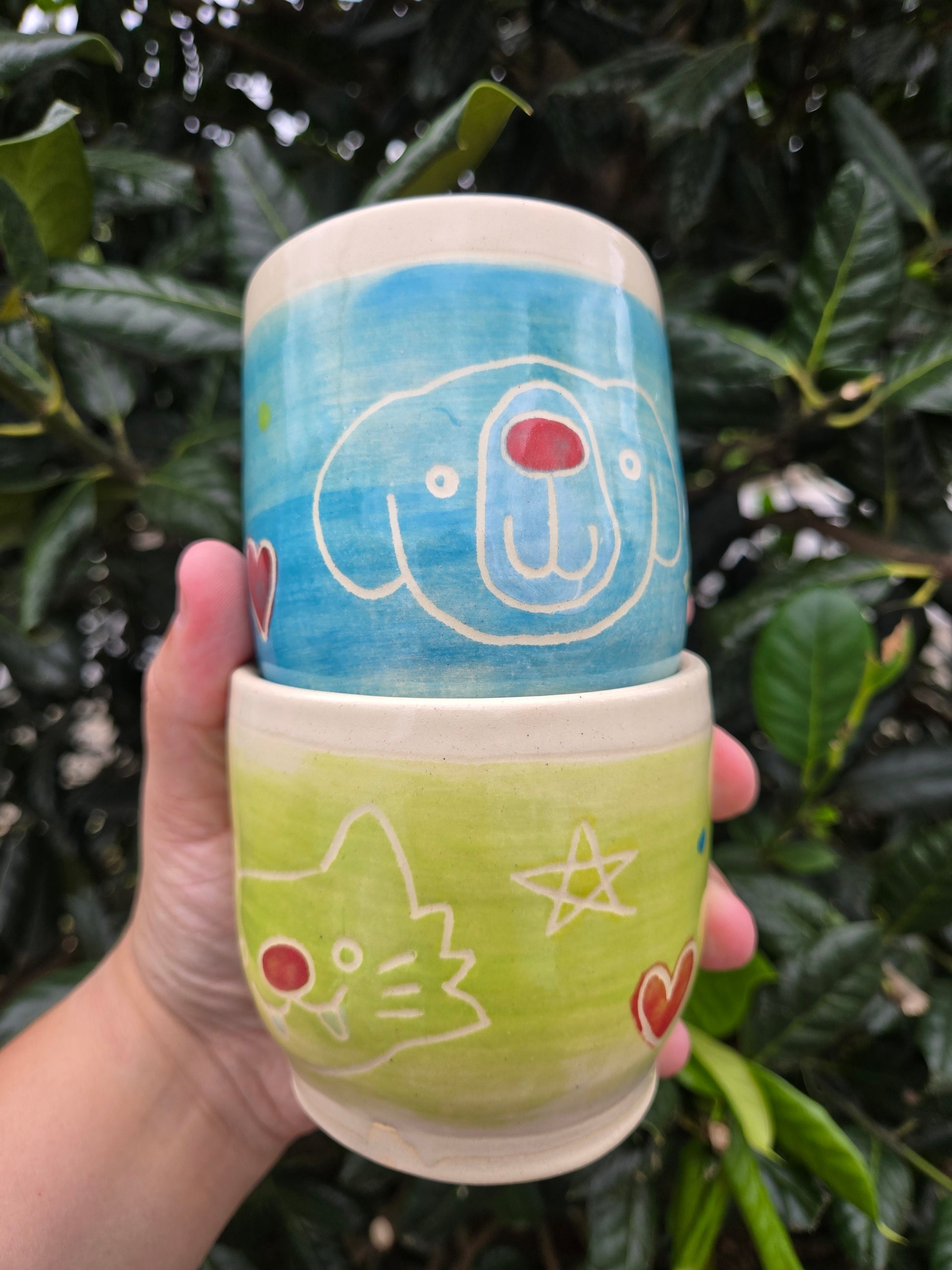 Cups are wheel thrown and their features are carved and underglaze decorated. They're fired with clear glaze outside and pink colored glaze inside, meaning they're water and food safe.