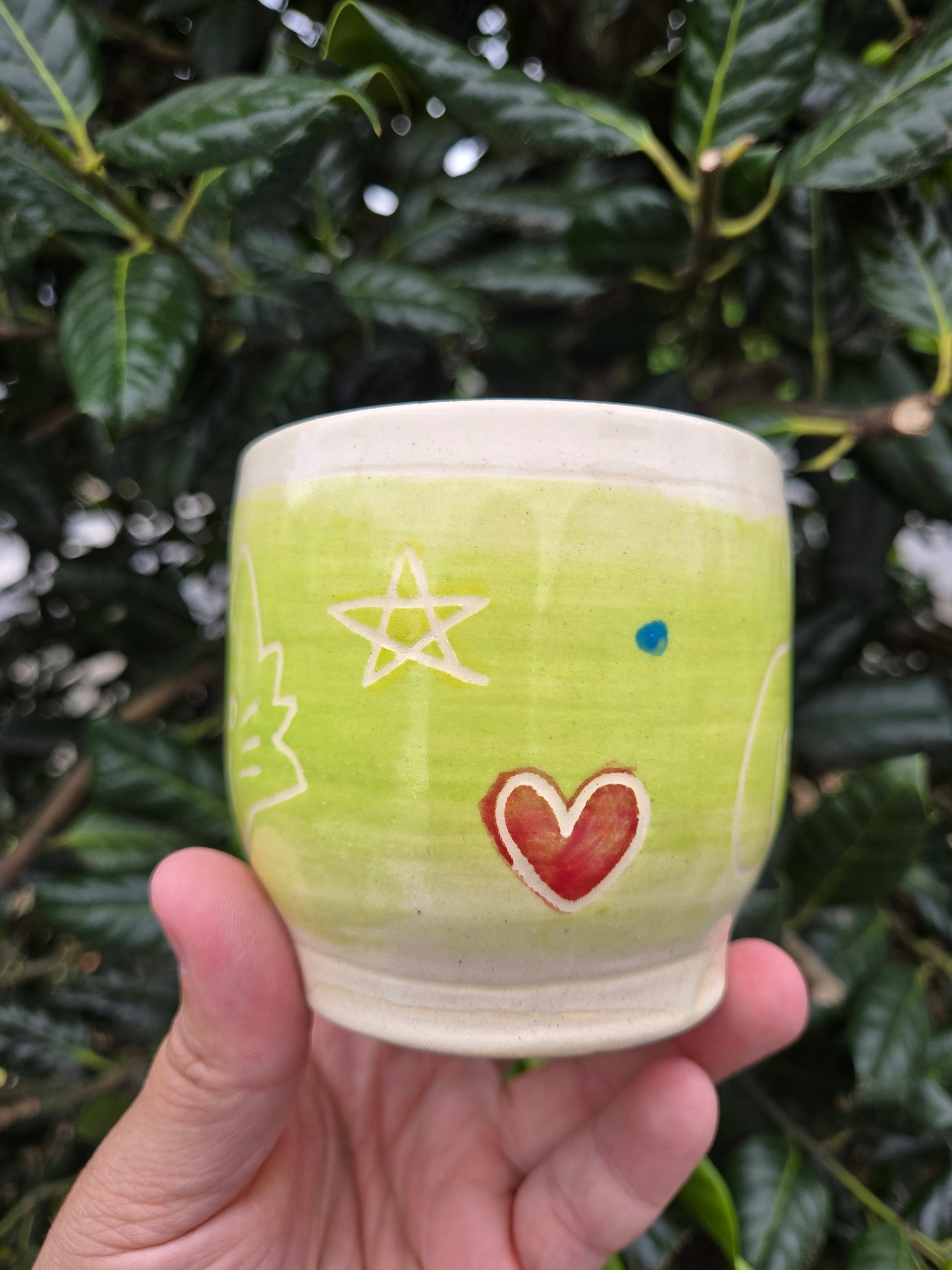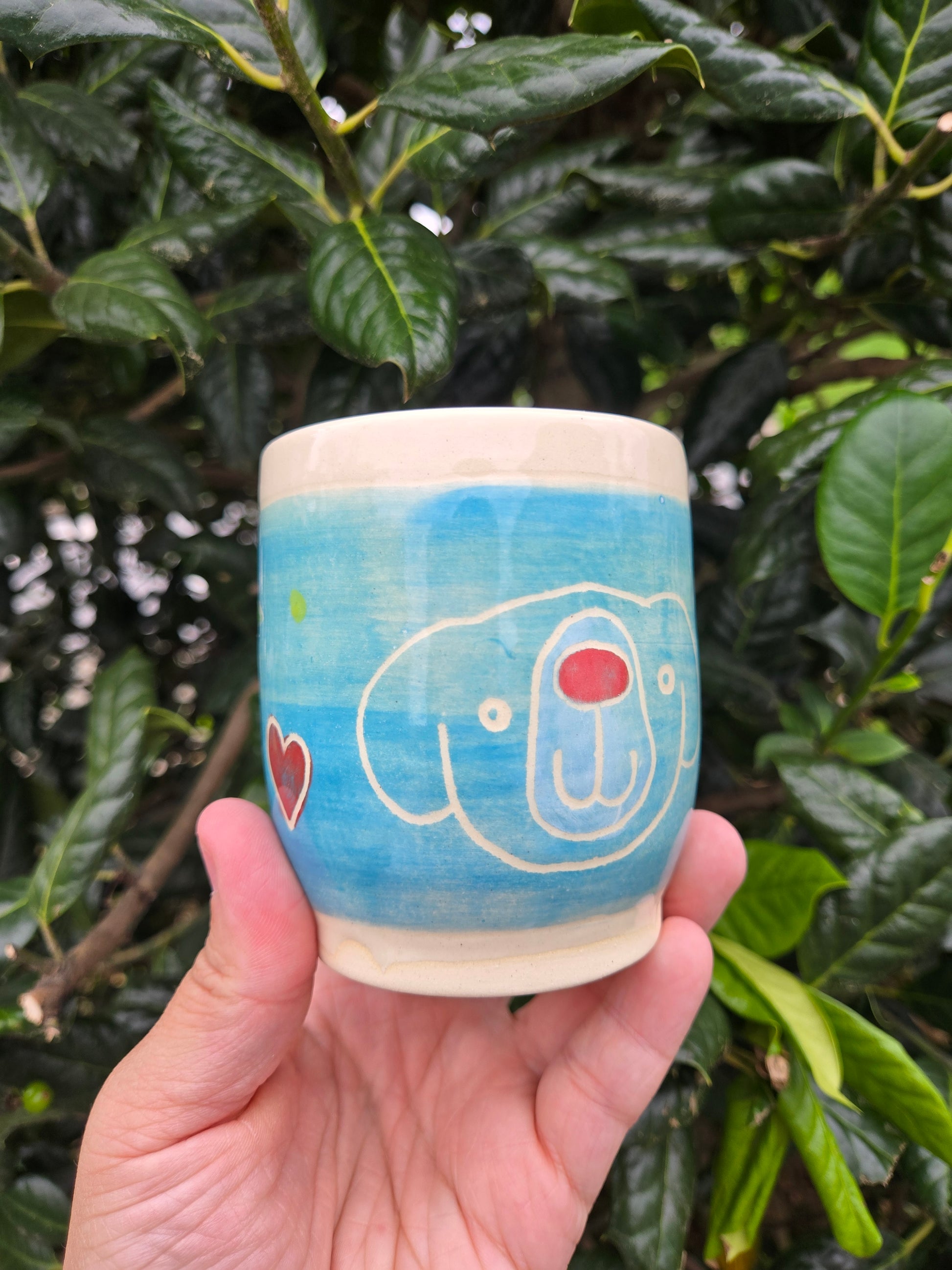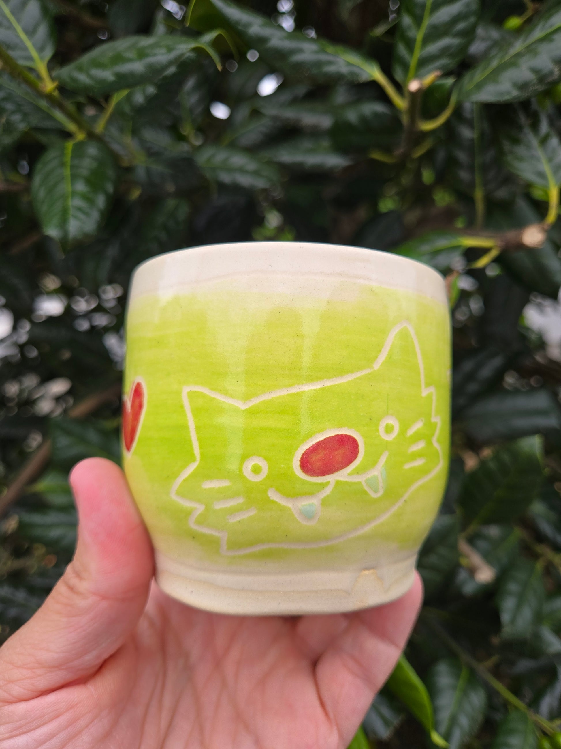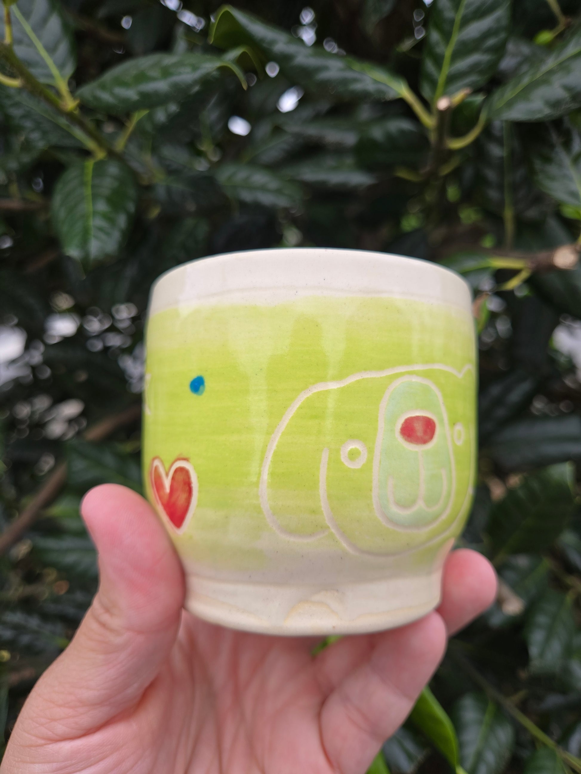 Cups are wheel thrown and their features are carved and underglaze decorated. They're fired with clear glaze outside and pink colored glaze inside, meaning they're water and food safe.