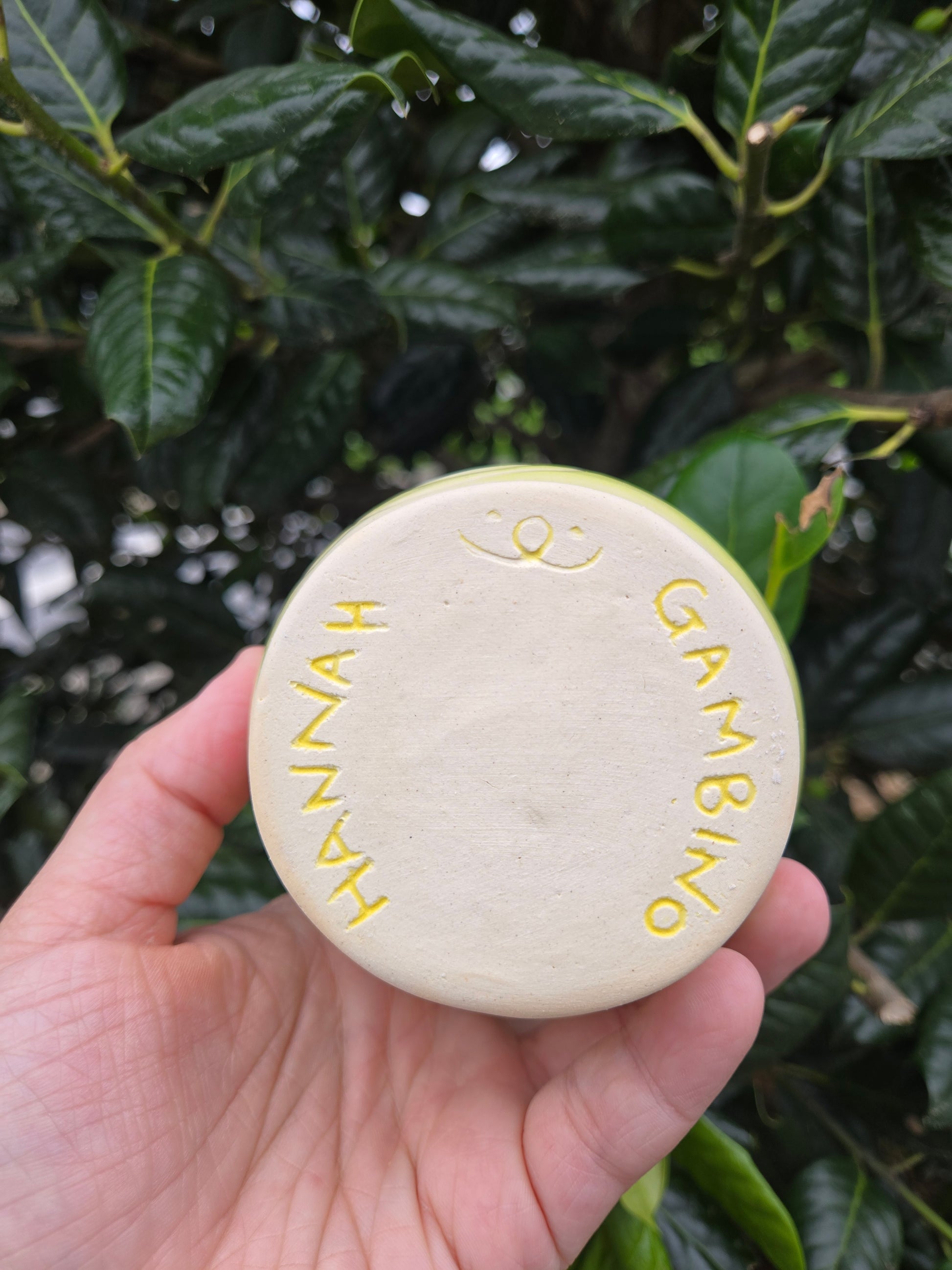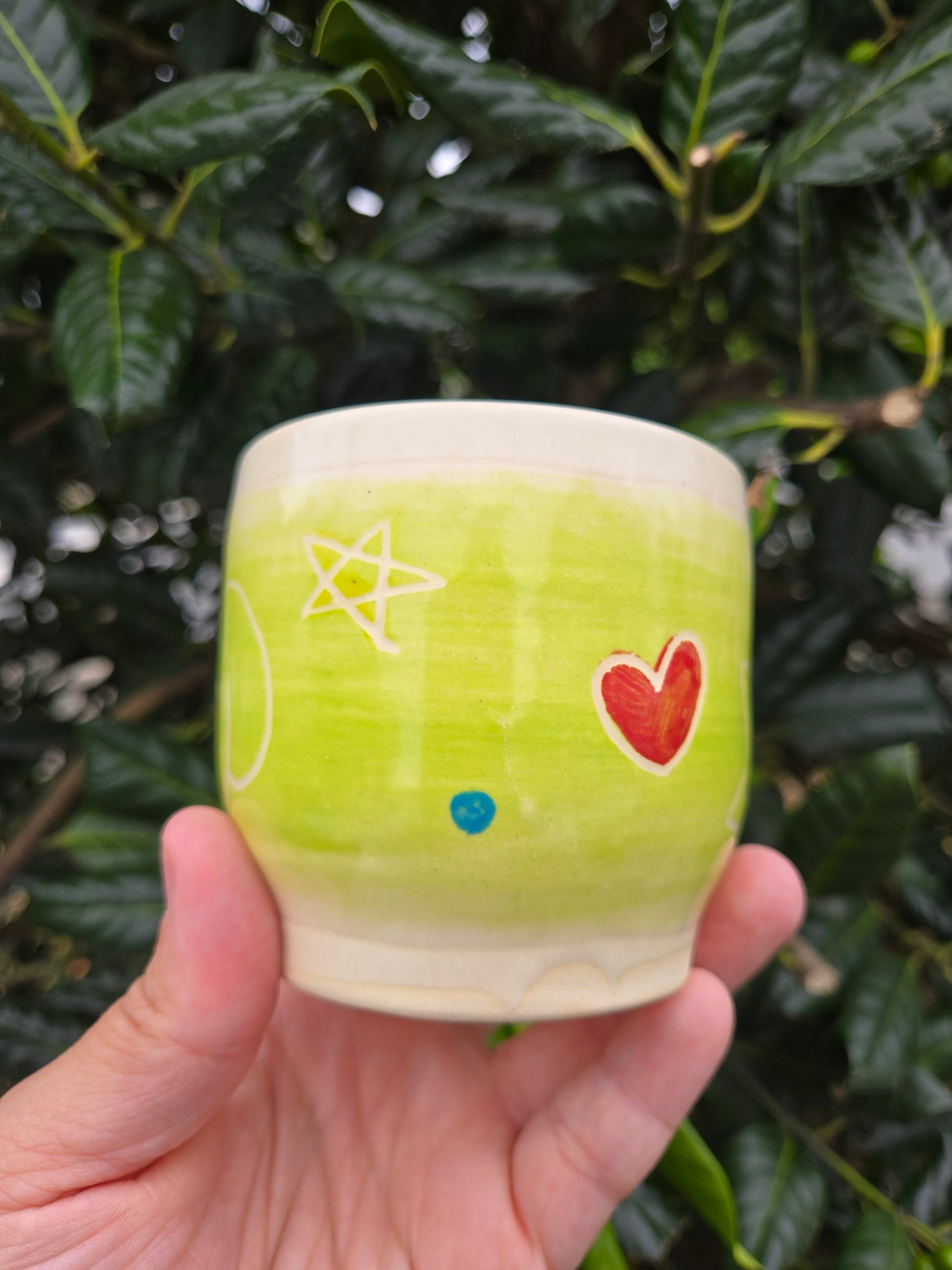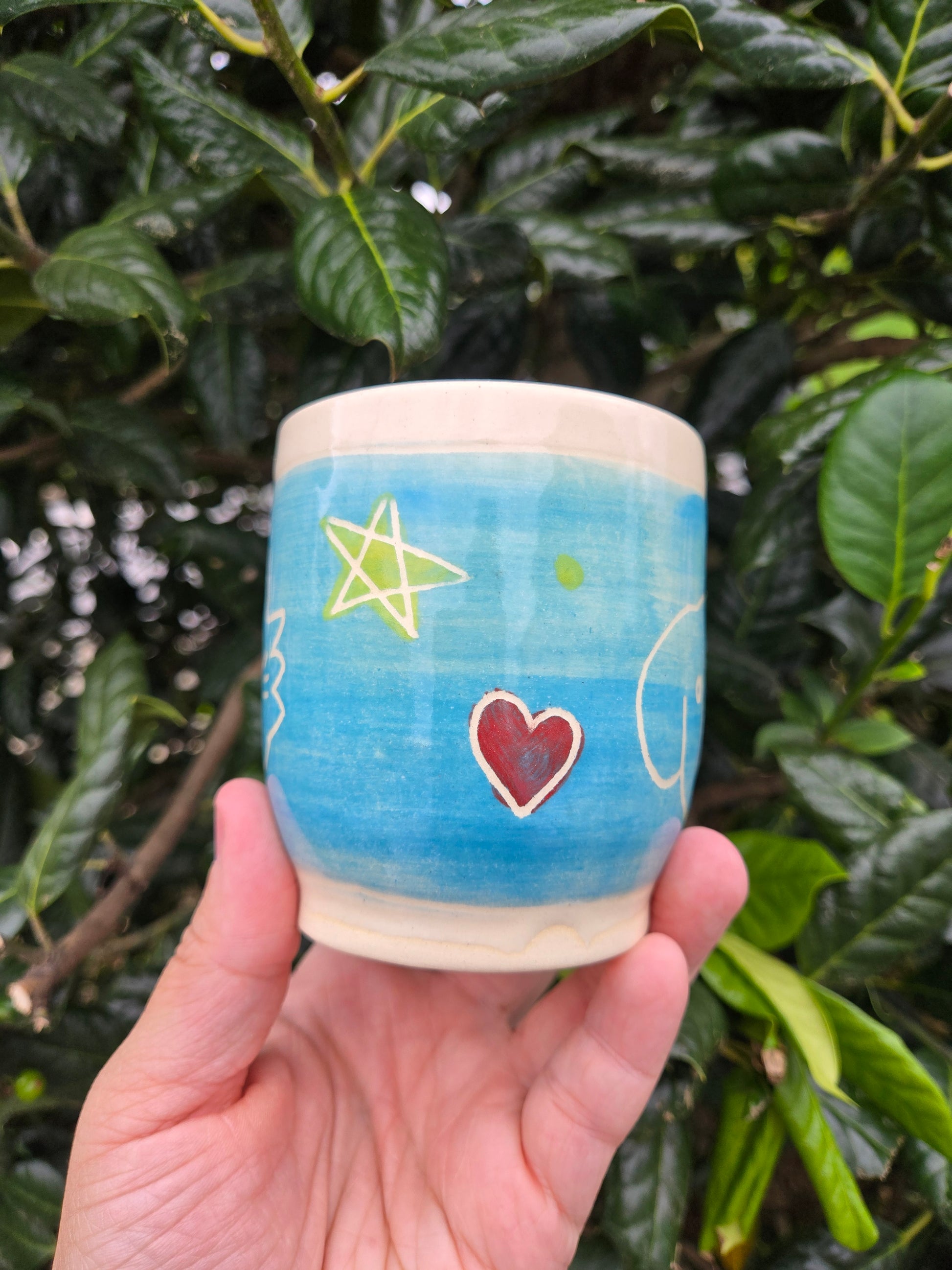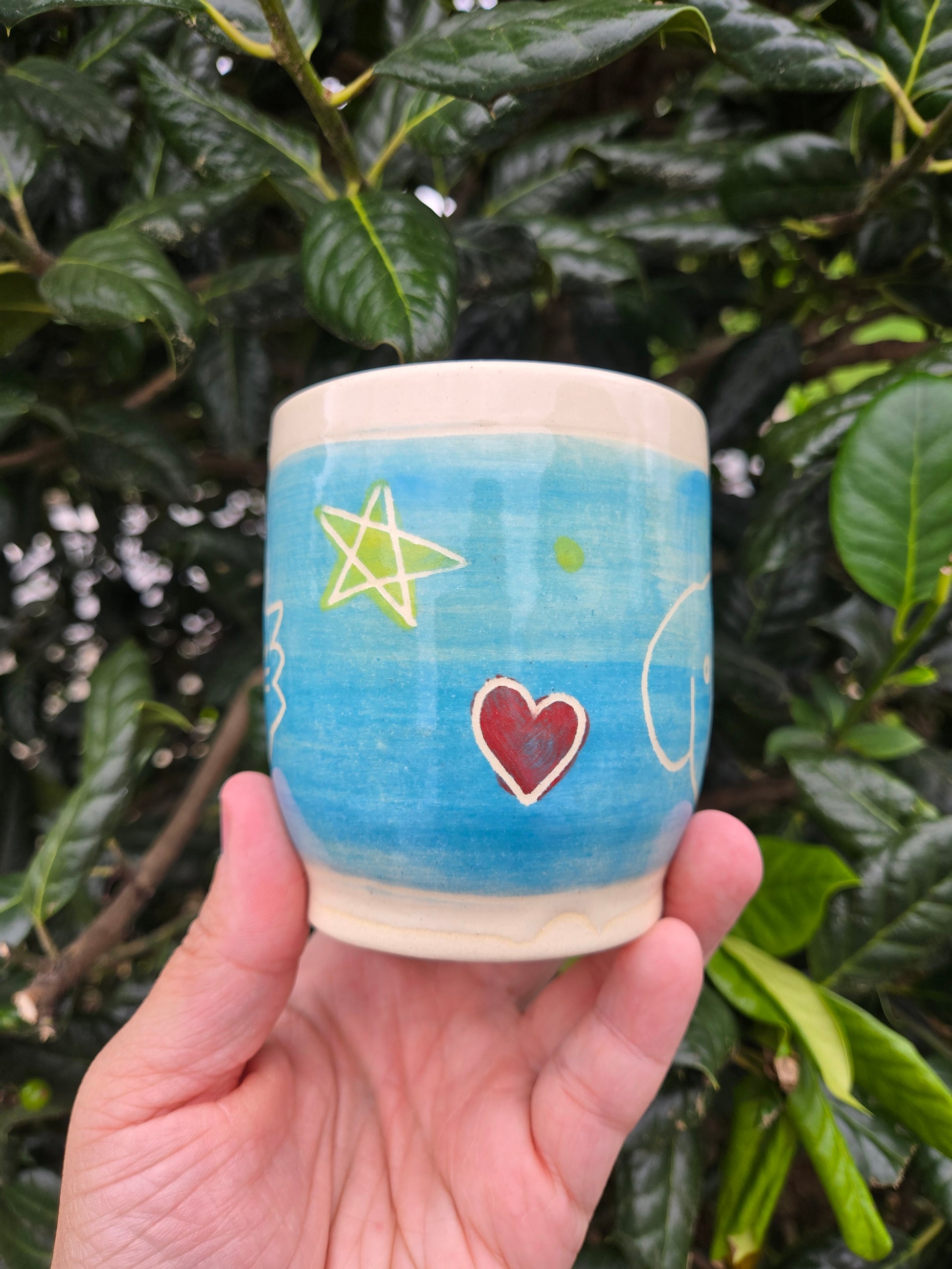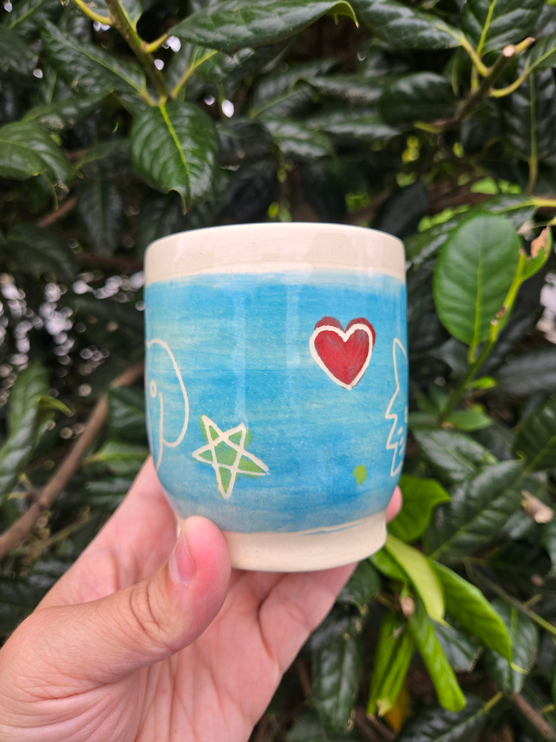 Cups are wheel thrown and their features are carved and underglaze decorated. They're fired with clear glaze outside and pink colored glaze inside, meaning they're water and food safe.