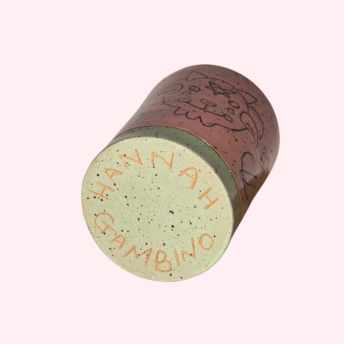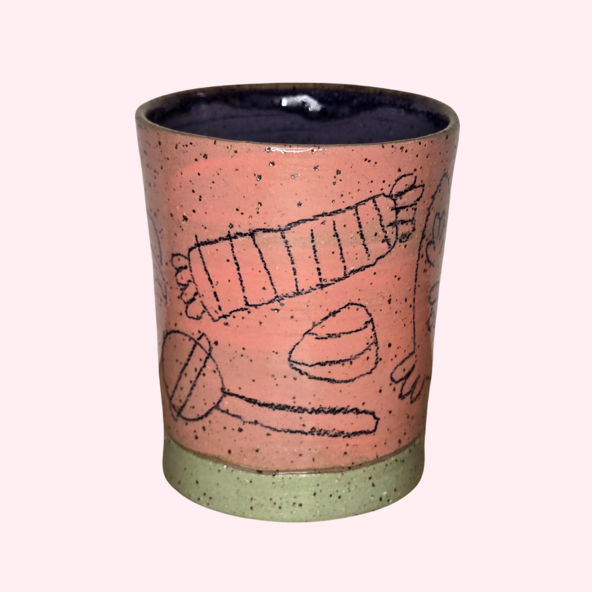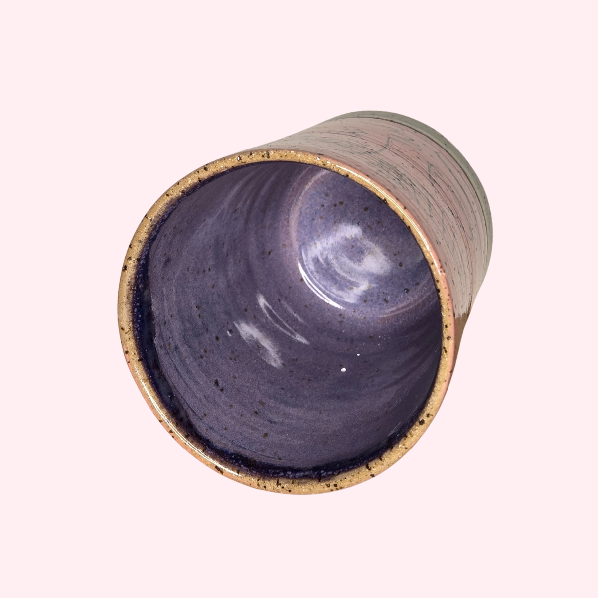 Underglaze decorated outside with clear glaze finish & purple glaze inside.