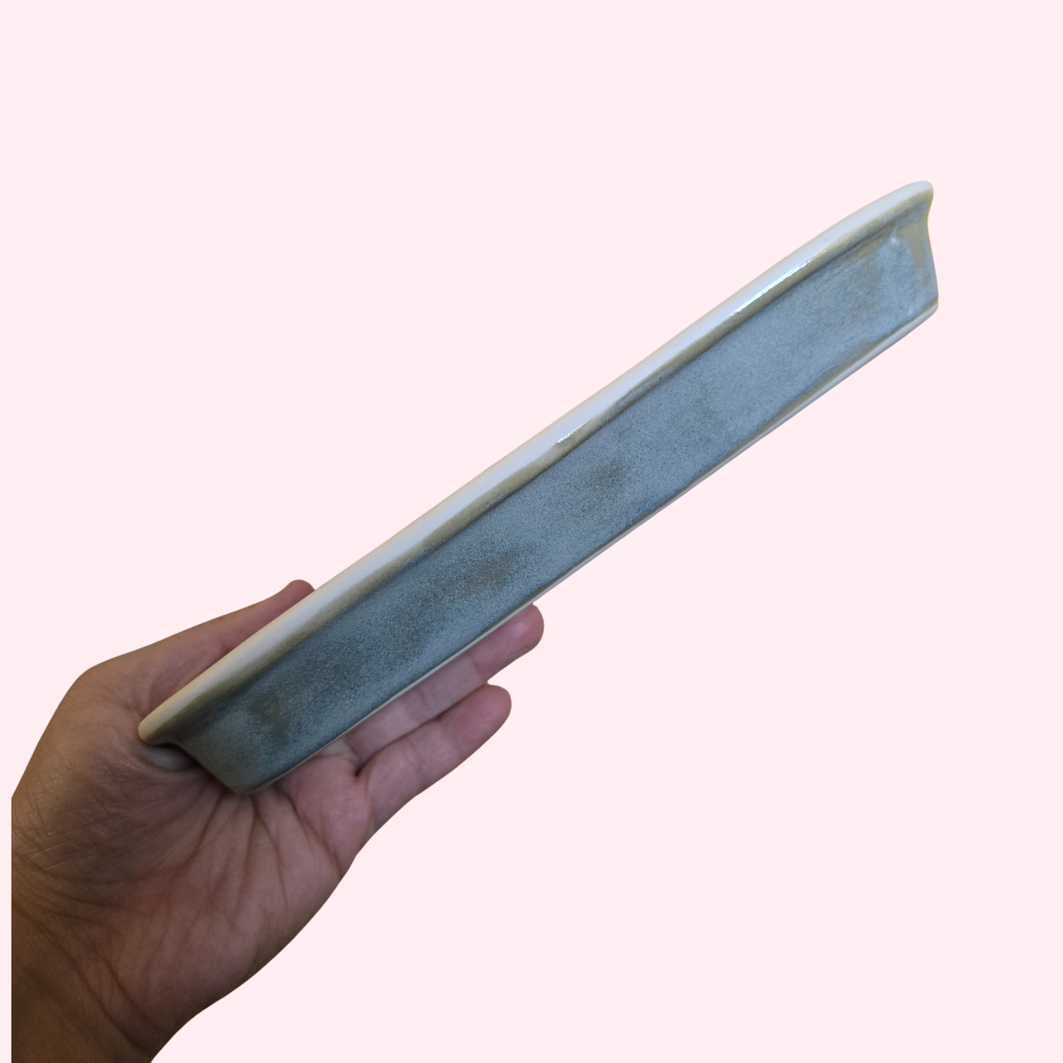Black underglaze decorated and carved, clear glazed, with frost blue glaze border.